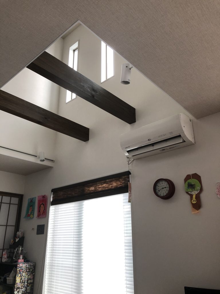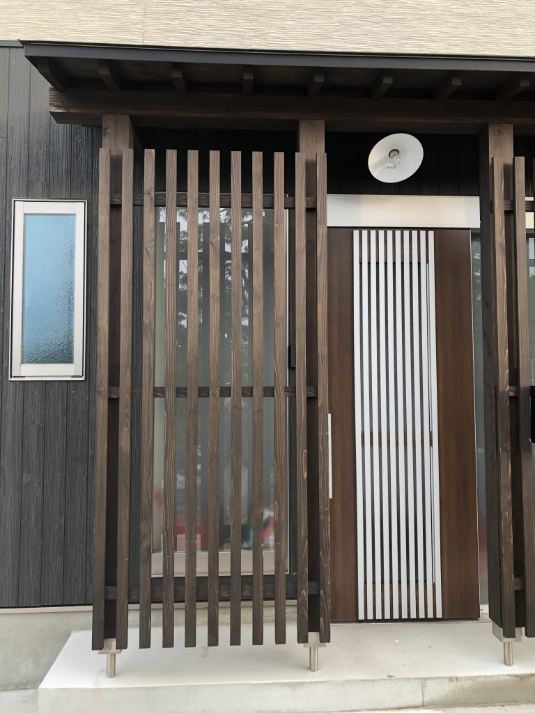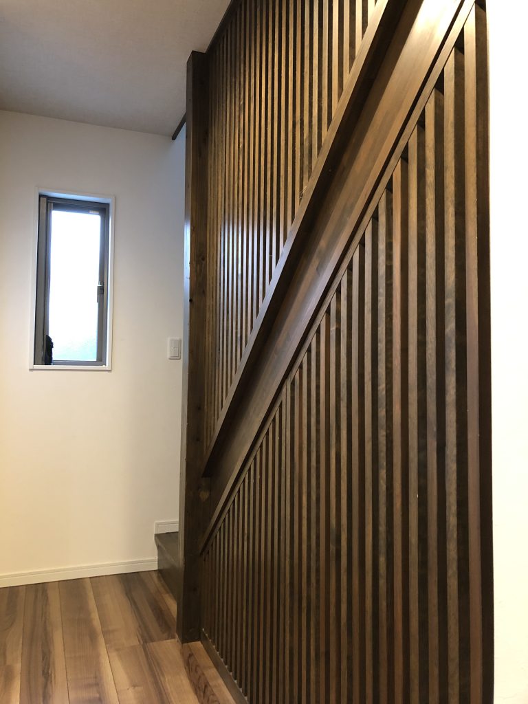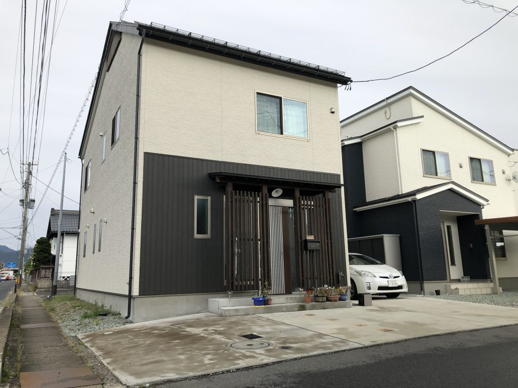 木造二階建住宅。オール電化の4LDK。和風テイストの格子デザインが特徴で、和室、洋室を完備。無垢材の見えるリビング吹抜けが解放感を演出。これで駐車スペースも確保してます。幹線道路に面した良好な立地です。